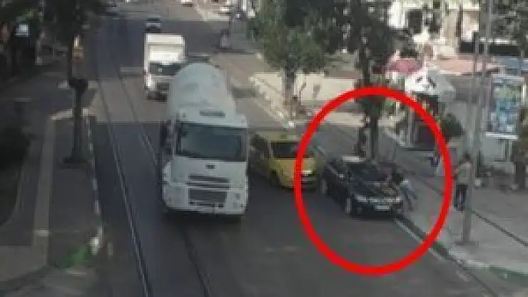 Bursa'da seyir halindeki bir tankeri geçmek isteyen sürücü, önündeki park halindeki araca çarptı. Aracın önünde duran bir kişi ise ezilmekten son anda kurtuldu.