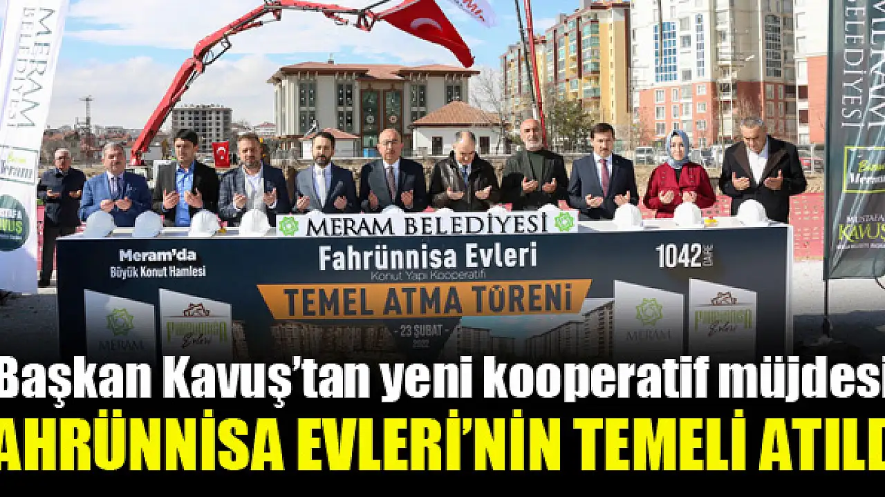 Meram'ın 'Büyük Konut Hamlesi' aralıksız şekilde devam ediyor. Yaklaşık 60 bin rekor başvuru sayısı ile gündeme oturan Fahrünnisa Evleri'nin temeli düzenlenen törenle atıldı.