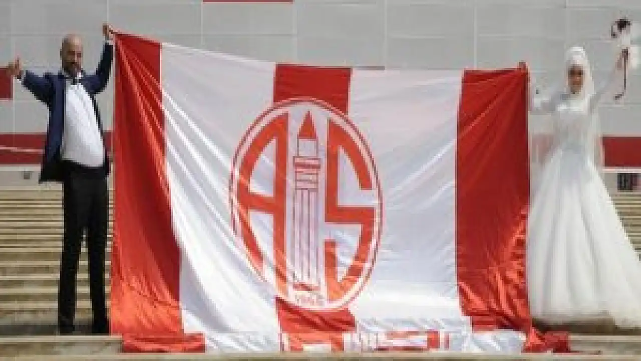 Antalya'da bir gelin, fanatik Antalyasporlu eşine takımın dev bayrağı ile yeni Antalya stadyumu önünde sürpriz yaptı. Bayrakla poz veren çift, ilginç bir düğün fotoğrafına imza attı.