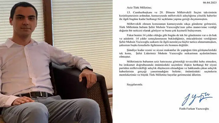 Merhum Muhsin Yazıcıoğlu'nun oğlu Fatih Furkan Yazıcıoğlu, seçimlerde herhangi bir partiden milletvekili adaylık düşüncesi olmadığını, hakkında çıkarılan adaylık haberlerinin ise gerçeği yansıtmadığını duyurdu.
