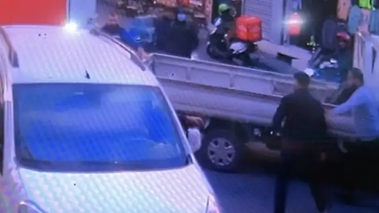 Güvenlik kameralarına yansıyan görüntülerde, sürücülerin tartışması görülüyor. Otomobilden inen bıçaklı saldırgan kamyonetteki sürücülere saldırıyor. Çevredekiler kavgayı ayırıyor.