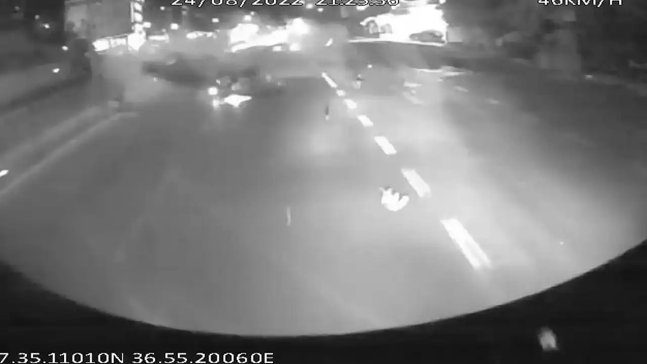 Kaza anı, kazaya karışan halk otobüsünün içindeki güvenlik kamerasına da yansıdı. Görüntülerde Otomobilin orta refüjdeki aydınlatma direğine çarpması ve otobüse çarpıp aşağı doğru inmesi görüldü.
