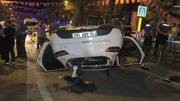 Bursa'da yüksek hızla makas atan sürücü 2 araca çarpıp takla attı. Araçta sıkışan bir kişi ağır olmak üzere 2 kişi yaralandı. Kaza anına ait görüntüler ortaya çıktı.
