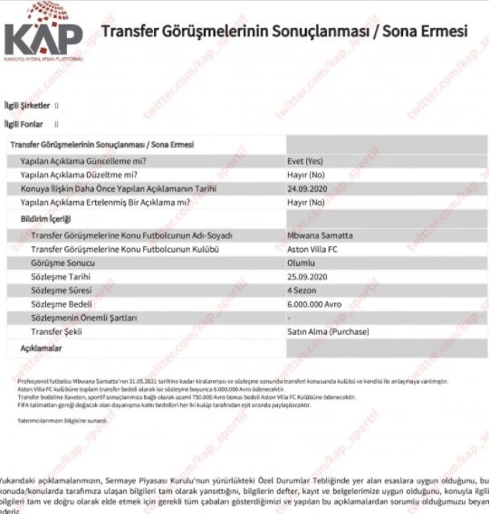 "Profesyonel futbolcu Mbwana Samatta'nın 31.05.2021 tarihine kadar kiralanması ve sözleşme sonunda transferi konusunda kulübü ve kendisi ile anlaşmaya varılmıştır.