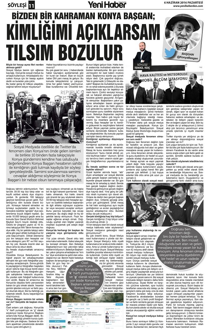 Sosyal Medyada özellikle de Twitter’da fenomen olan Konya’nın önde gelen isimleri ile birlikte 10 binden fazla takipçisiyle Konya gündemini kendine has üslubuyla değerlendiren Konya Başgan hesabının sahibi ile kimliğinin gizli tutmak kaydıyla bir söyleşi gerçekleştirdik. Samimi sorularımıza samimi cevaplar aldığımız söyleşimiz ile Konya Başgan’ı bir nebze olsun tanımaya çalışacağız.