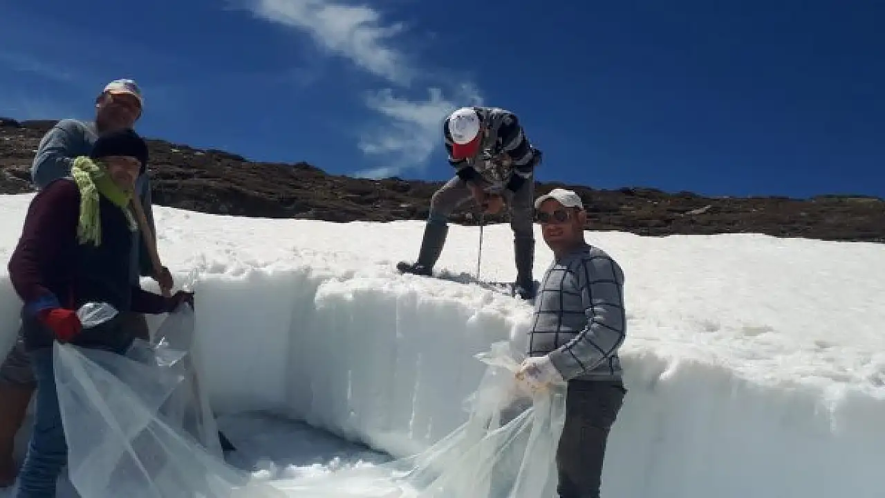 Aydın'da kavurucu sıcaklarda vatandaşların tercihleri arasında yer alan kar helvası için mesai başladı. 1800 rakımlı Madran Dağı'nın zirvesindeki kar kuyularından çıkarılan karlar çuvallanarak, soğuk hava depolarına taşınmaya başladı.