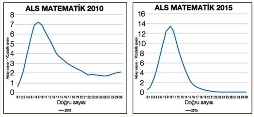 - ALS’de kopya yapıldığına dair en çarpıcı grafik ifadeyi yukarıda yan yana görüyorsunuz. Solda 2010 ALS matematik sınavında doğru cevapların grafik dağılımı var. Baktığınızda sınava katılan adayların yüzde 2’sinin (1.200’ü aşkın kişi yani) 30’da 30 doğru cevap verdiği görülüyor. Buna 28 ve 29 doğru cevap verenleri de ekleyince zaten okulların kontenjanını kat kat aşan miktarda aday sayısına ulaşıyorsunuz. Buna karşılık ÖSYM güvenli hale geldikten sonra, 2015’te yapılan sınavın grafiğine bakınca doğru cevap sayılarının nasıl düştüğünü ve Türkiye’nin aynı yaş grubu için yaptığı diğer sınavların sonuçlarına benzemeye başladığını çıplak gözle de görebiliyor insan. Yani askeri liselere FETÖ’cü sızmayı görmek için öyle MİT araştırmasına şuna buna ihtiyaç yok, ortada büyük bir anormallik olduğunu görmek için bu verilere bakmak yeterli aslında.