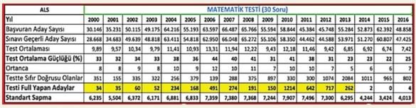 - TSK’ya subay olarak giriş kapılarından en önemlisi olan Askeri Liseler Sınavı (ALS) sonuçlarına toplu halde bakmak bile arızayı görmeye, göstermeye yeterli. Yukarıdaki tablo ALS’nin sadece matematik sınavı sonuçlarını gösteriyor ama diğer sınavlarda da durum benzer. Bu tabloya darbe