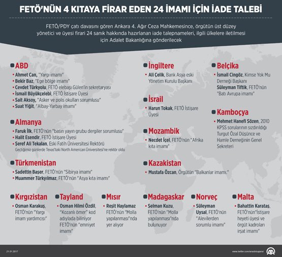 FETÖ İstişare Üyesi Harun Tokak için İsrail, KHK ile kapatılan Kimse Yok Mu Derneği Başkanı İsmail Cingöz ile FETÖ'nün "Batı Avrupa imamı" Süleyman Tiftik için Belçika ve 2010 KPSS sorularının sızdırıldığı, dağıtıldığı belirtilen Turgut Özal Düşünce ve Hamle Derneğinin Genel Sekreteri Mehmet Hanefi Sözen için Kamboçya adli makamlarına iade talepnamesi hazırlayan mahkemenin, FETÖ'nün "Sibirya imamı" Sadettin Başer ve "Asya kıta imamı" Muammer Türkyılmaz için de Türkmenistan'a iade yazısı göndereceği belirtildi.