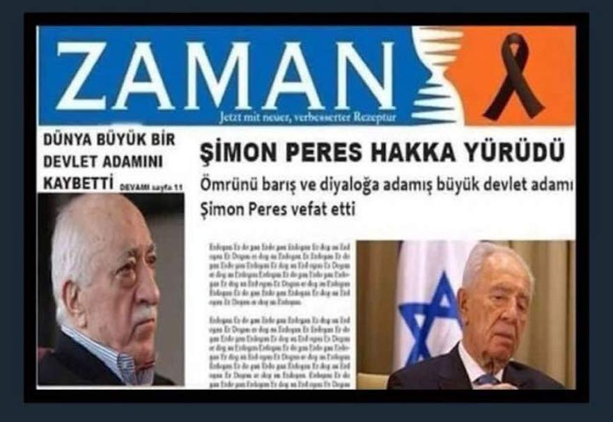 Geçtiğimiz günlerde ölen İsrail eski Cumhurbaşkanı Simon Peres'in haberini manşete taşıyan Zaman Gazetesi'nin Almanya baskısında "Şimon Peres Hakka yürüdü" manşeti atıldı.