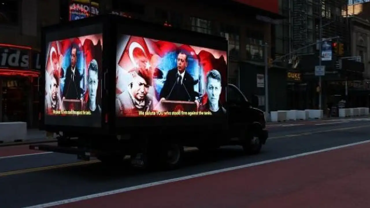 FETÖ'nün iç yüzü New York'taki Times Meydanı'nda dijital ekranlı kamyonete yansıtılan görsellerle anlatıldı.