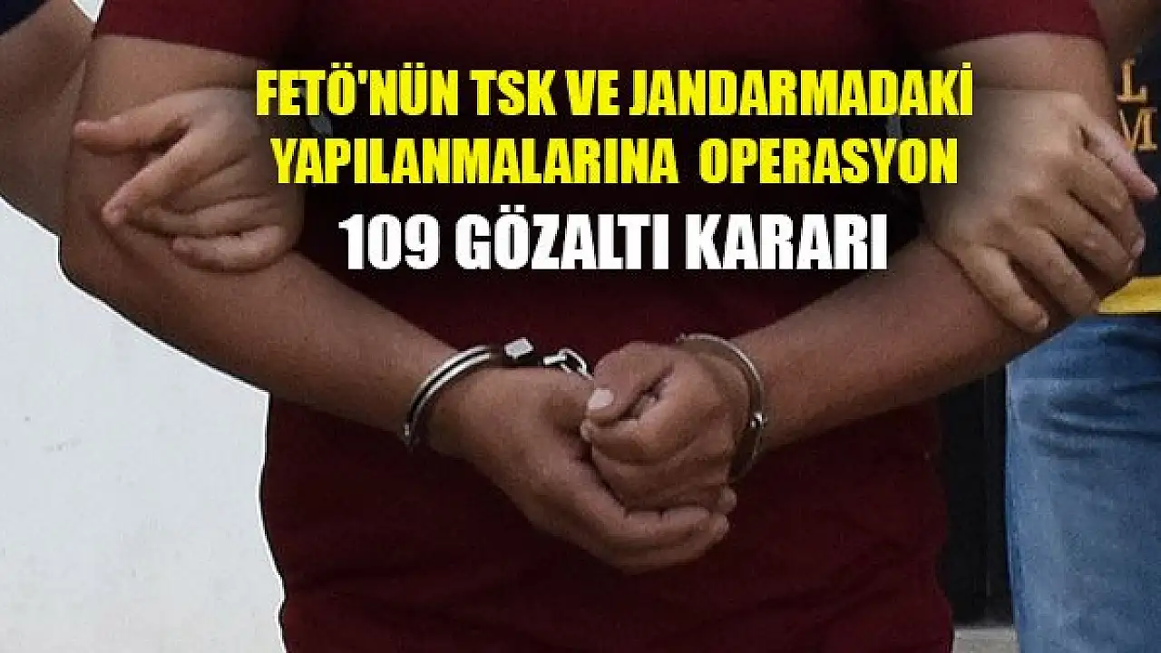 FETÖ'nün TSK, Hava Kuvvetleri Komutanlığı ve Jandarma Genel Komutanlığı'ndaki yapılanmasına yönelik soruşturmalarda 109 şüpheli hakkında yakalama kararı çıkarıldı.