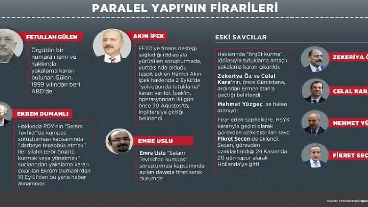 Fetullahçı Terör Örgütü'ne (FETÖ) yönelik dava ve soruşturmalarda haklarında yakalama kararı olan Fetullah Gülen, Emre Uslu, Ekrem Dumanlı, hakim, savcı ve iş adamlarının yanı sıra bazı emniyet müdürlerinin de yer aldığı firariler arasına, askerler de eklendi.