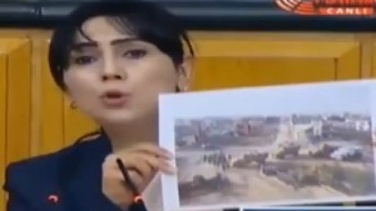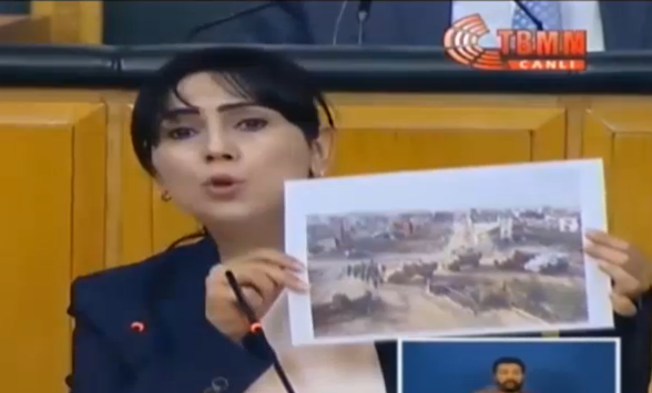 Nusaybin'de biten operasyonlardan sonra asılan Türk bayraklarının fotoğrafını gösteren Yüksekdağ, 'Bu fotoğrafta acizlik var.' dedi.