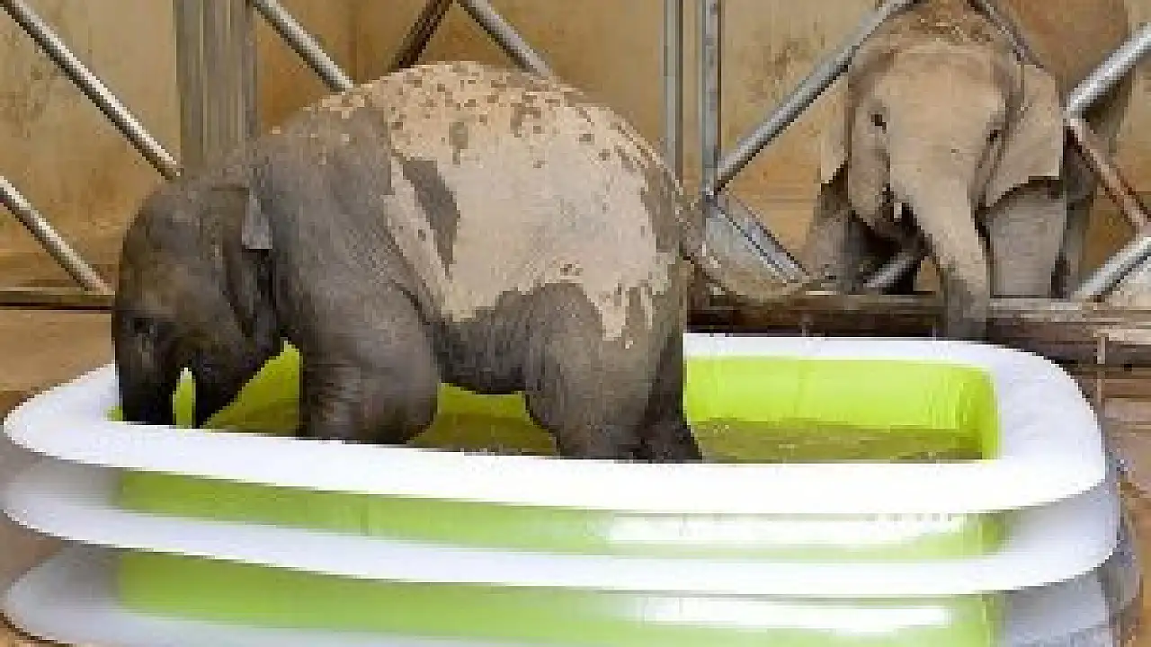 Kendisi için hazırlanan havuza girmekte başlarda tereddüt eden fil yavrusu, daha sonra suyun keyfini çıkarmaya başladı.