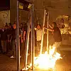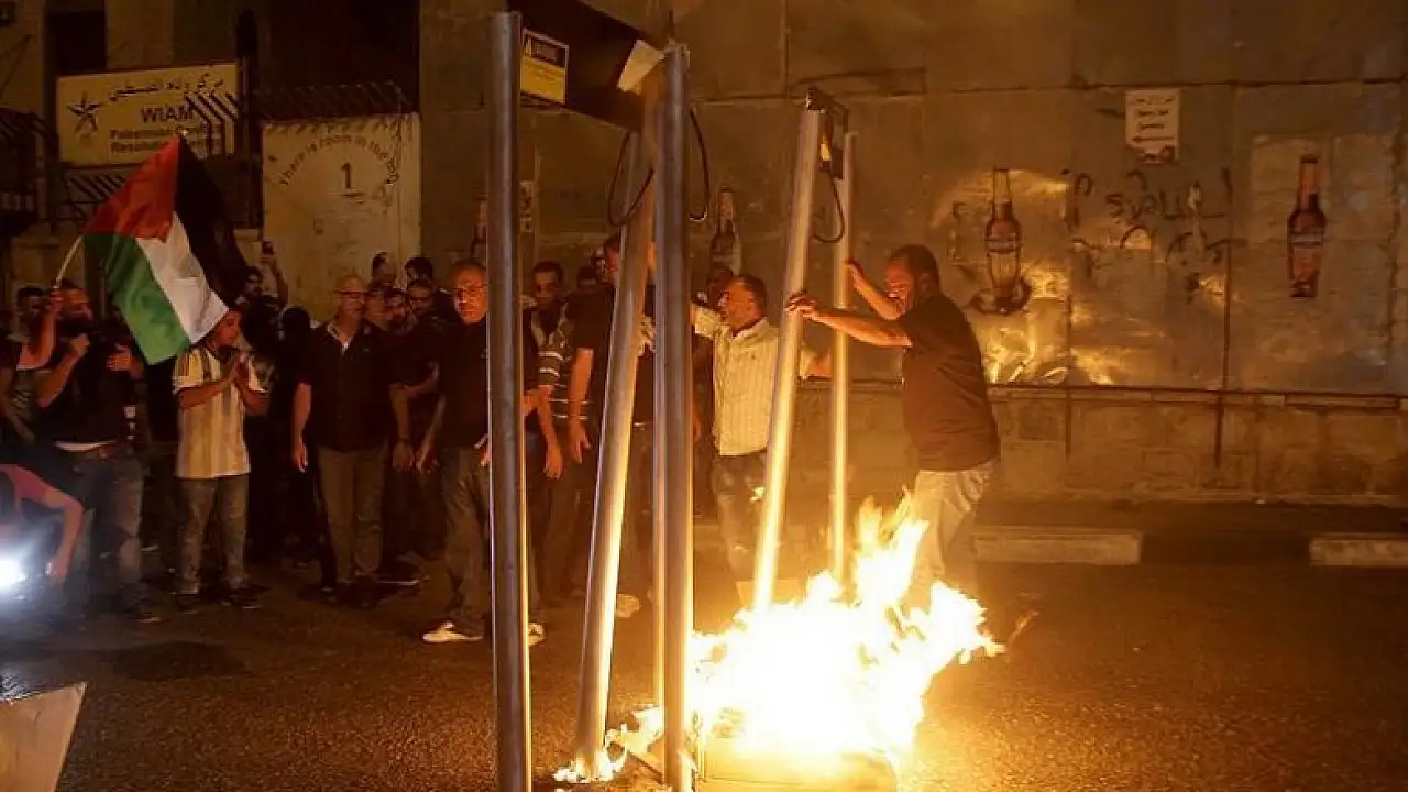 Batı Şeria'nın Beytüllahim kentinde, çok sayıda Filistinli, bir askeri kontrol noktası yakınlarında maketten yaptıkları metal arama dedektörlerini ateşe verdi.