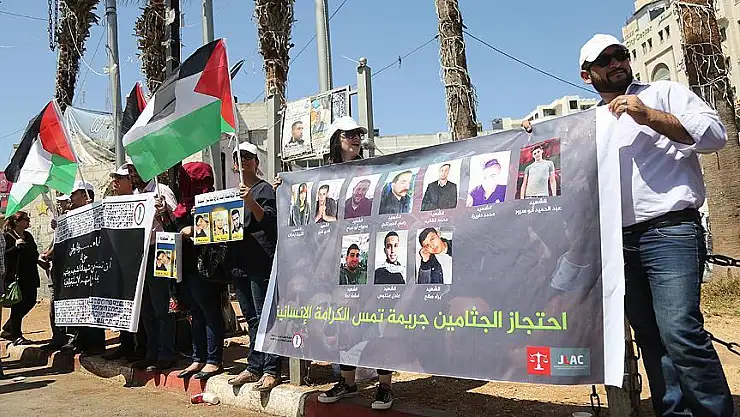 Birleşmiş Milletler (BM) İnsan Hakları Yüksek Komiserliğinin Gazze'deki ofisi önünde düzenlenen gösteriye katılan onlarca Filistinli, İsrail’den alıkoyduğucenazeleri teslim etmesini ve kayıp Filistinlilerin akıbetini açıklamasını talep etti.