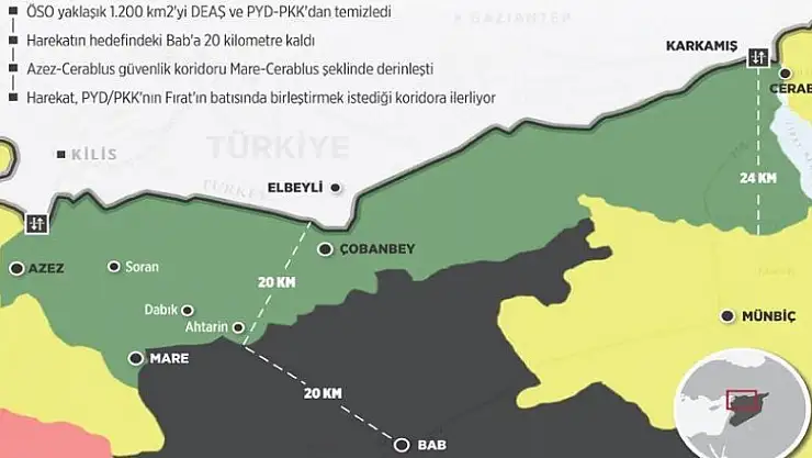 Fırat Kalkanı Harekatı'nda Özgür Suriye Ordusu (ÖSO) Suriye'nin kuzeyinde yaklaşık bin 200 kilometrekare toprağı teröristlerden arındırdı. DEAŞkontrolündeki Bab ilçesinin 20 kilometre yakınına ulaşan harekat, PYD/PKK'nın tasarladığı koridorun içine girmeye başladı.