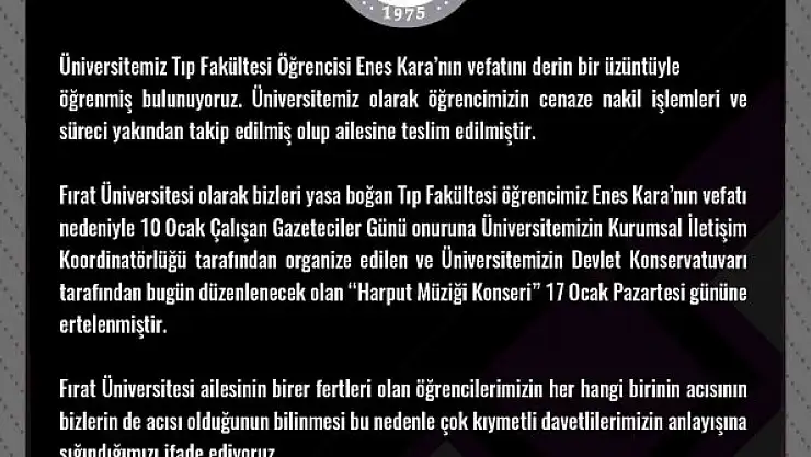 Fırat Üniversitesi tarafından 10 Ocak Çalışan Gazeteciler Günü onuruna düzenlenecek olan Harput Müziği Konseri, tıp öğrencisi Enes Kara'nın vefatından dolayı ertelendi.