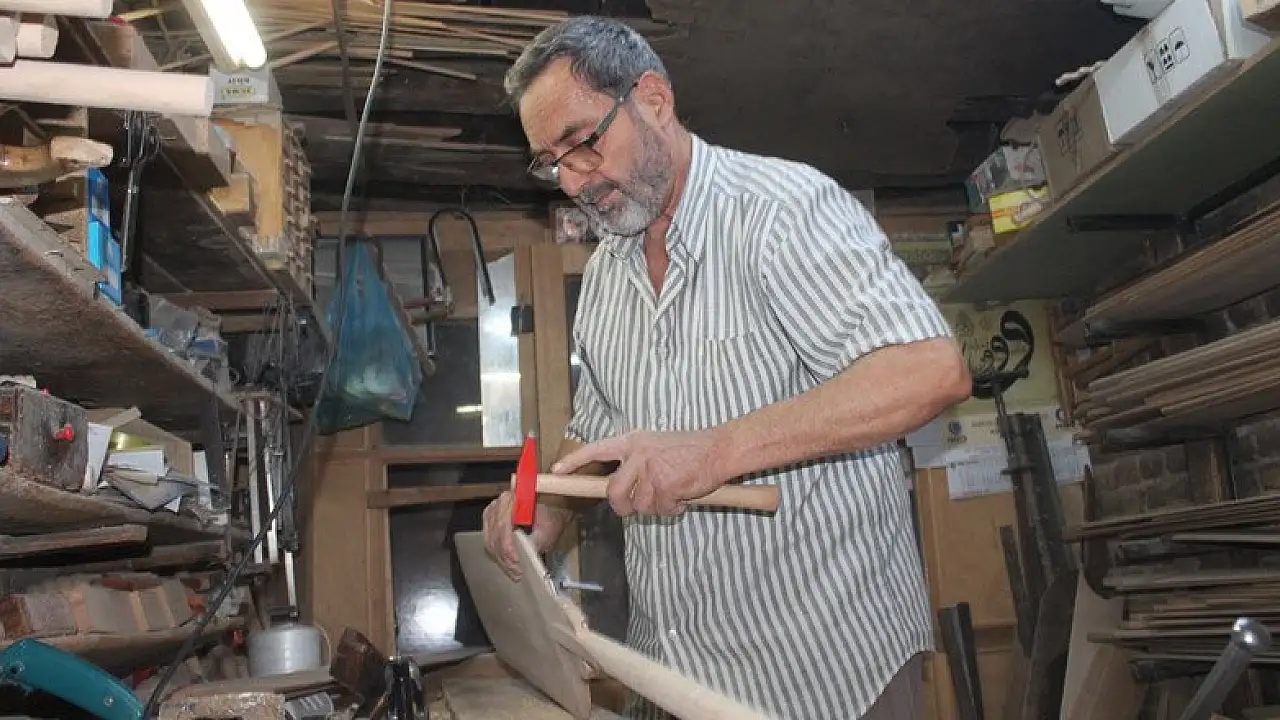 Konya'da yaşayan Muzaffer Büyüközkan, akrabalarından devraldığı asırlık dükkanında 55 senedir gürgen ağacına şekil verip fırın küreği imal ederek sanatını yaşatıyor.