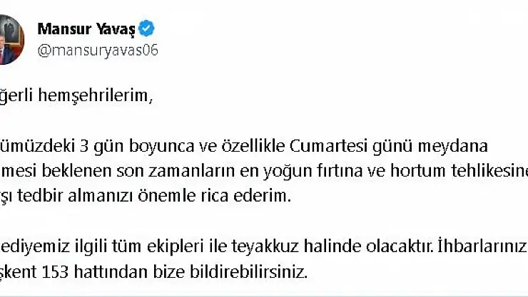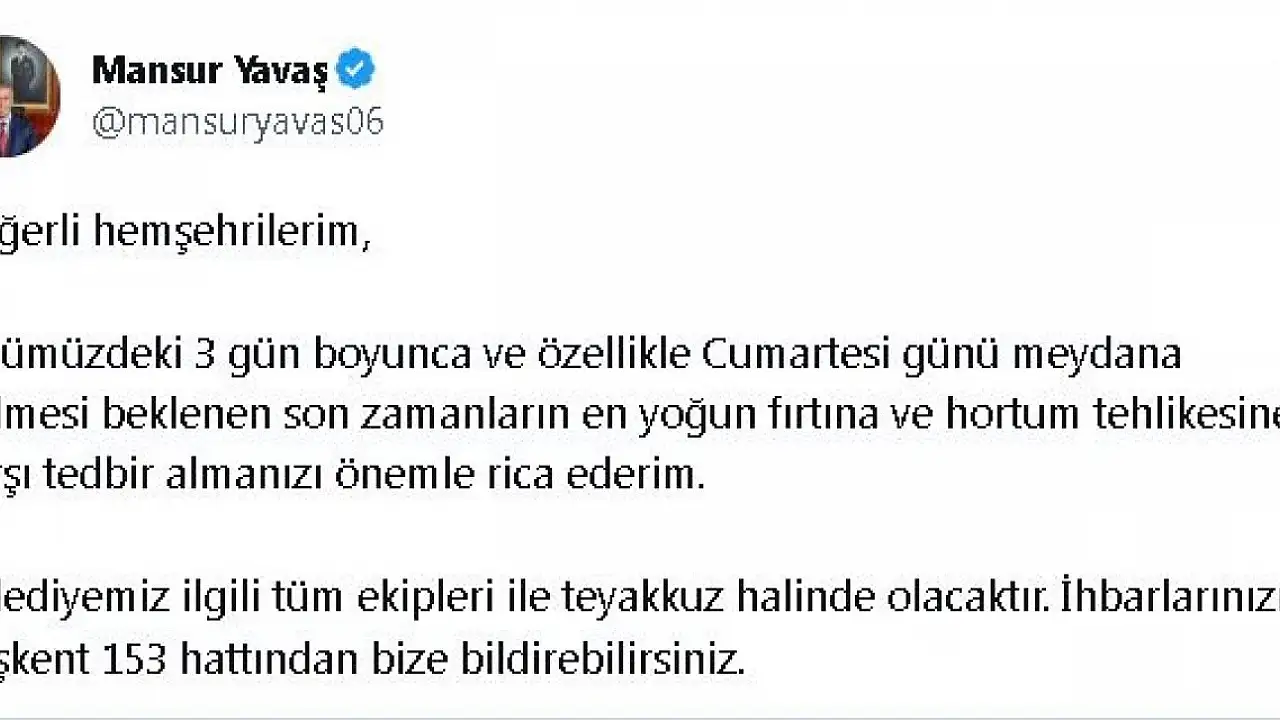 Ankara Büyükşehir Belediye Başkanı Mansur Yavaş, Twitter hesabından yaptığı açıklamada, fırtına ve hortuma karşı tedbirli olunmasını isteyerek, "Değerli hemşerilerim; önümüzdeki 3 gün boyunca ve özellikle cumartesi günü meydana gelmesi beklenen son zamanların en yoğun fırtına ve hortum tehlikesine karşı tedbir almanızı önemle rica ederim. Belediyemiz ilgili tüm ekipleri ile teyakkuz halinde olacaktır. İhbarlarınızı Başkent 153 hattından bize bildirebilirsiniz" dedi.
