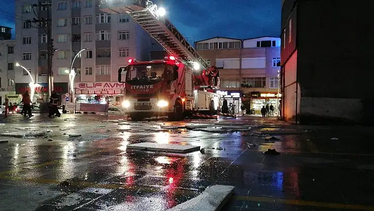 Kocaeli'de şiddetli fırtına neticesinde 7 katlı binanın çatısında bulunan kaplama levhaları aşağıya düştü.