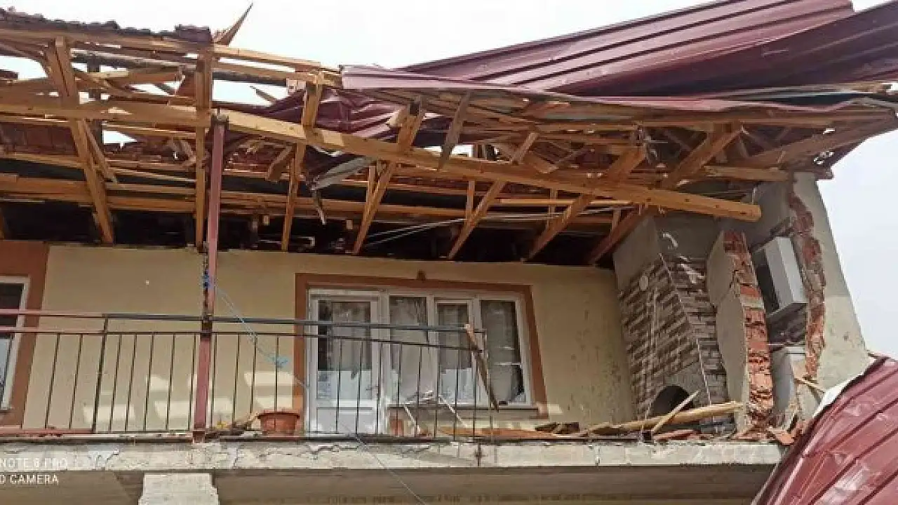 Denizli'de fırtınanın uçurduğu bir evin çatısı, önce bitişiğindeki binaya, ardından ise traktörün üzerine düşerek büyük oranda hasar oluşturdu.