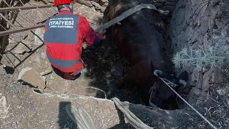 Olay yerine Muğla Büyükşehir Belediyesi Milas itfaiye grup amirliği ekipleri sevk edildi. İtfaiye ekipleri ip yardımı ile çukura düşen ineği kurtardı.