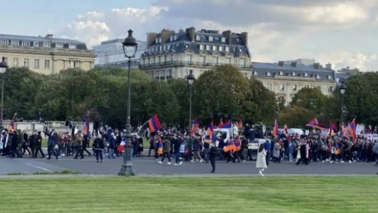 Fransa’daki Ermeni Örgütleri Koordinasyon Konseyi (CCAF) tarafından organize edilen protestoda, Invalides Meydanı'nda toplanan göstericiler, Azerbaycan’ın Ermenistan'ın saldırılarına karşı meşru müdafaa hakkını kullanmasını protesto etti.