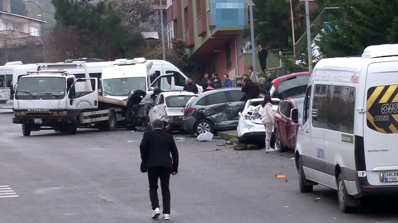 Kartal'da freni boşalan kamyon, yol kenarında park halinde bulunan 14 otomobile çarparak durabildi. Kaza sonucu servis minibüsünde bulunan 1 çocuk yaralandı.