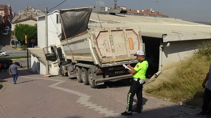 Freni boşalan kamyon 2 otomobile ve iş yerine çarptı