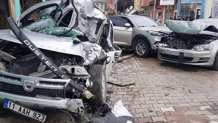 Bilecik'te, Tarım Kredi Kooperatifi şubesine yem indiren kamyon, freninin boşalması sonucu hareket etmeye başlayarak park halindeki 3 aracı adeta biçti.