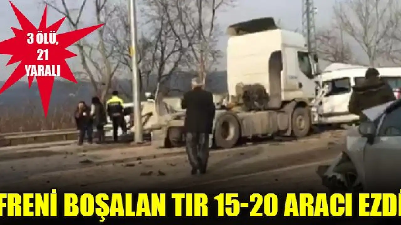 Bursa-Ankara kara yolunda meydana gelen zincirleme kazada, freni boşalan tır 15-20 aracı ezdi. Kazada 3 kişi hayatını kaybetti, 9'u ağır 21 kişi yaralandı.