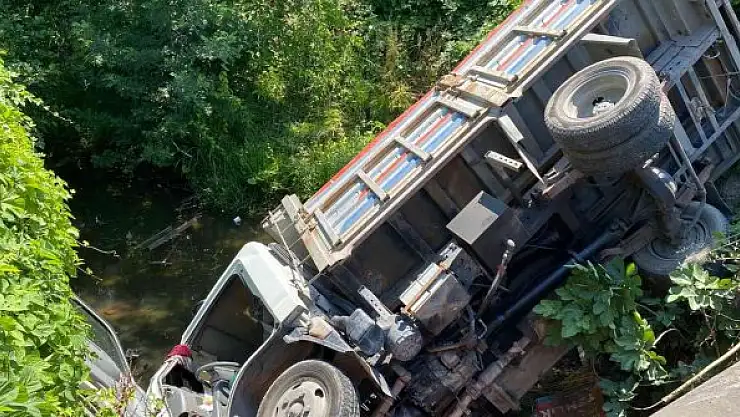 Yokuş aşağı seyir halinde olan kamyon, freni tutmayınca dereye uçtu. Sürücü, dereye uçan kamyondan burnu bile kanamadan kurtuldu.