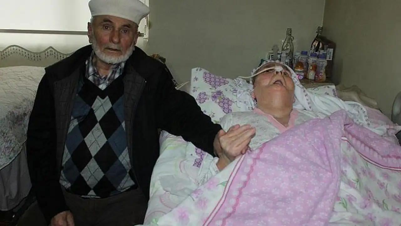Eşinin 7 senedir yatalak olduğunu ve konuşamadığını belirten Özkan, "Bazen dışarıdan gelir 'Nazmiye hanım, ne yapıyorsun' diye bağırırım. Gözlerini açar, bana cevap veremez ama öyle bakar. Yine de çok şükür böyle olsun da yanımda olsun. Ölse de buradan çıksa ev üzerime yıkılır." ifadesini kullandı.