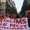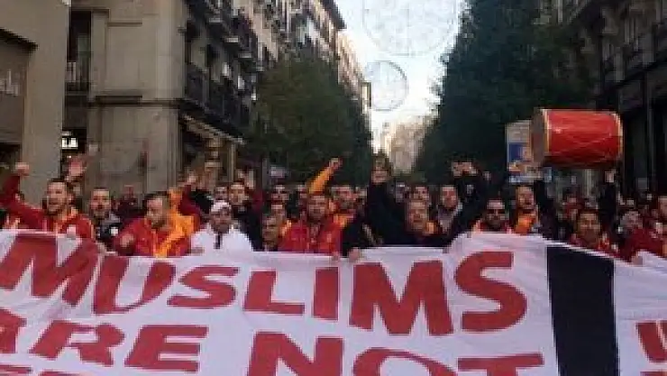 Galatasaray'ı desteklemek üzere Madrid'e giden taraftar grubu ultrAslan üyeleri, İngilizce ve İspanyolca 'Müslümanlar terörist değildir' yazılı pankartla yürüyüş yaptı.