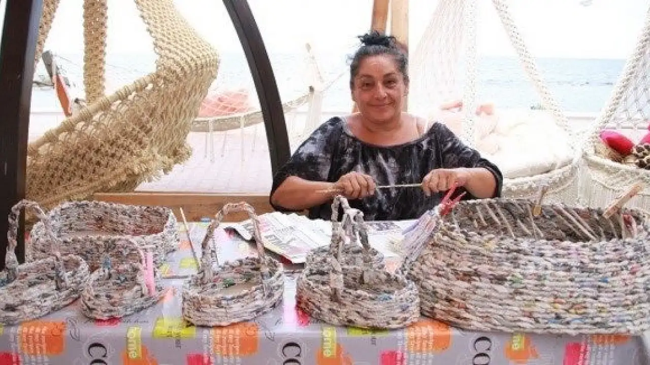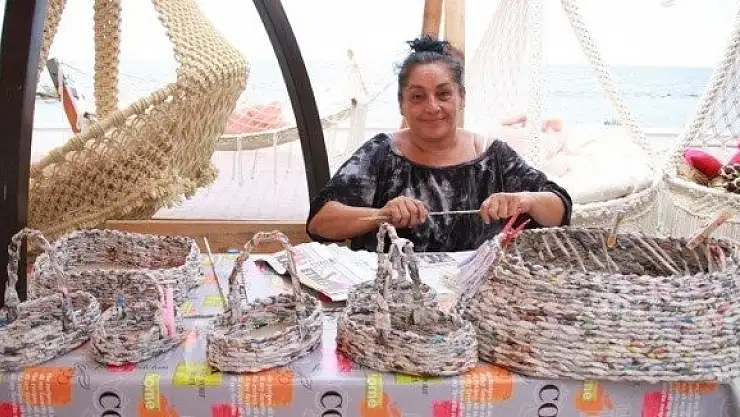 Yakakent ilçesinde yaşayan emekli hemşire İlter Pülgü, gazete kağıtlarından sepet yapıyor.