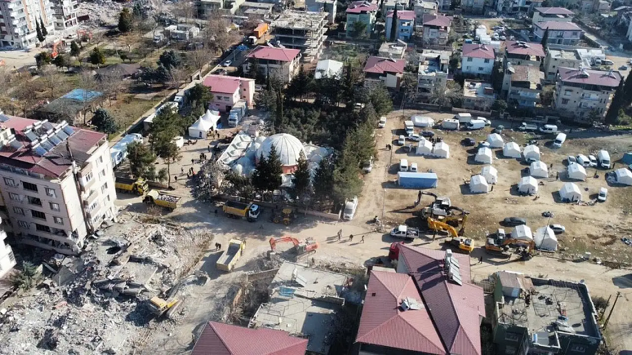 Gaziantep'in İslahiye ilçesinde depremin vurduğu binalar havadan görüntülendi. Arama ve kurtarma çalışmalarının sona erdiği binalarda iş makineleri enkaz kaldırmaya devam ederken, vatandaşlar gıda ve kıyafet ihtiyaçlarını gönüllüler tarafından oluşturulan noktalardan temin ediyor.