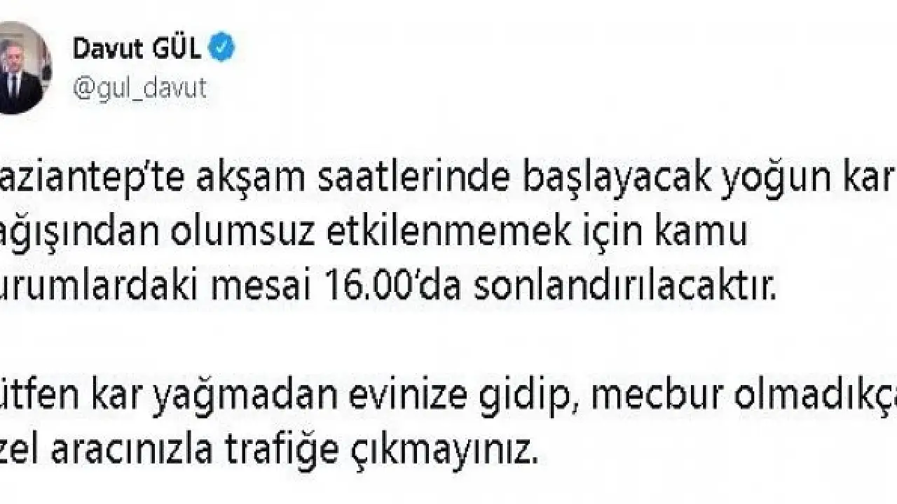 Akşam saatlerine doğru yoğun kar yağışı beklendiğini açıklayan Gaziantep Valisi Davut Gül, "Gaziantep'te akşam saatlerinde başlayacak yoğun kar yağışından olumsuz etkilenmemek için kamu kurumlardaki mesai 16.00'da sonlandırılacaktır. Lütfen kar yağmadan evinize gidip, mecbur olmadıkça özel aracınızla trafiğe çıkmayınız" ifadelerini kullandı.