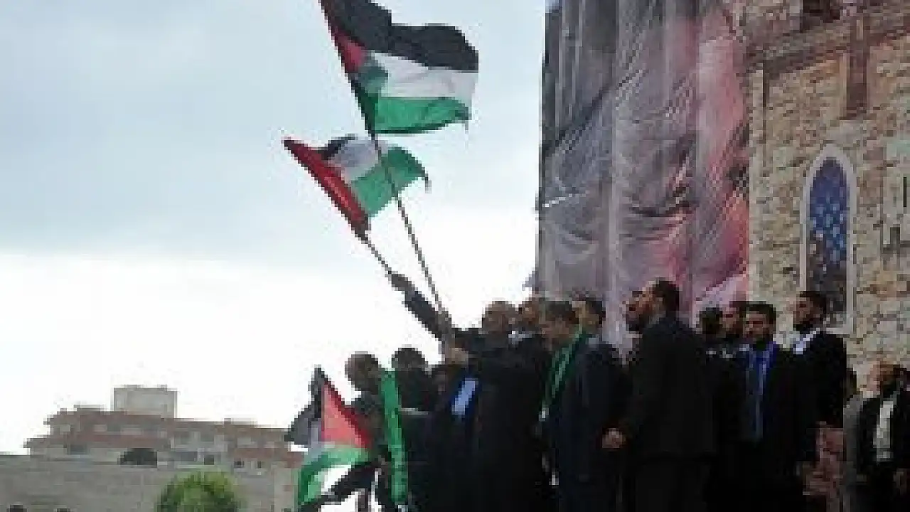Platformun arkasına ise geçen ay İsrail'in Gazze'ye düzenlediği hava saldırısında hayatını kaybeden Hamas'ın askeri kanadı İzzeddin Kassam Tugayları komutanı Ahmed Caberi'nin posterine yer verildi.