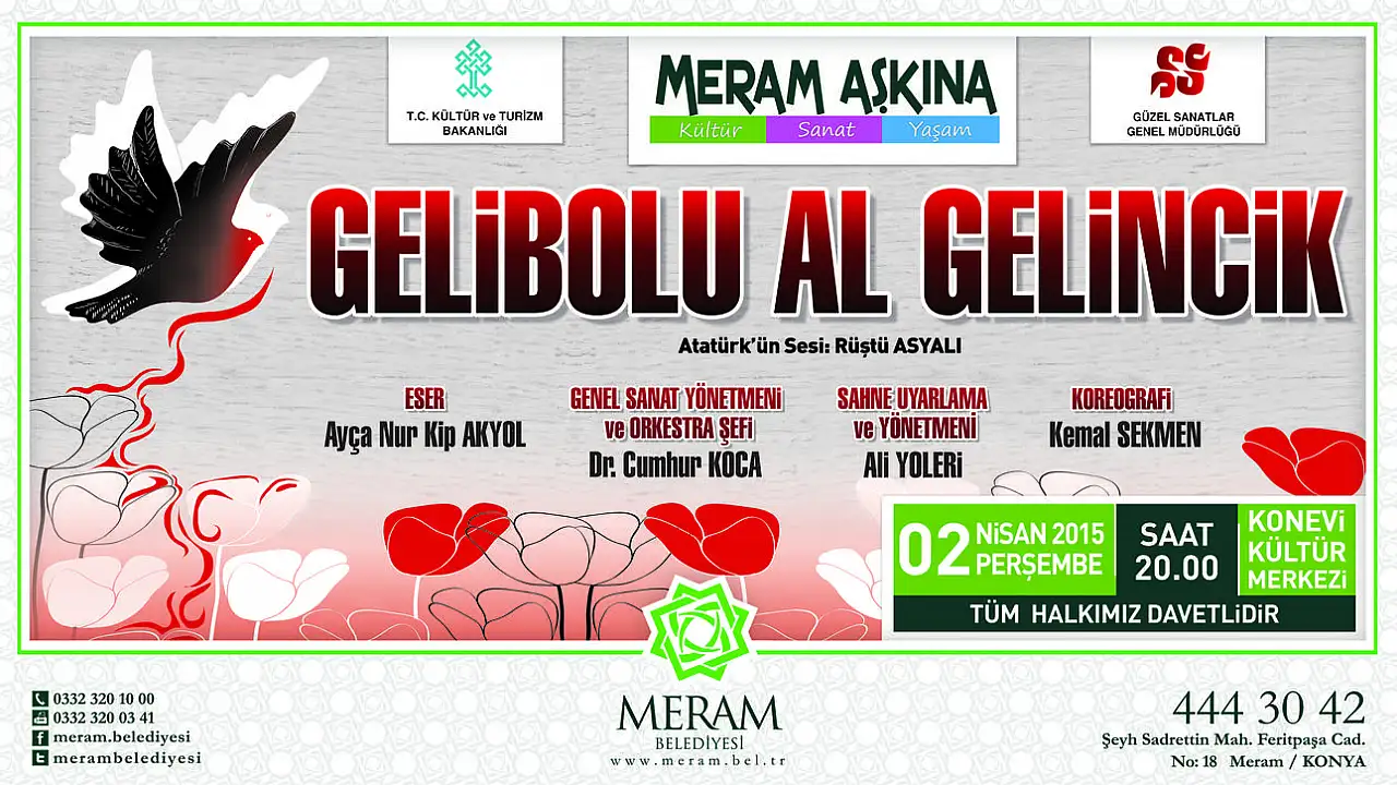 Meram Belediyesi tarafından Meram Aşkına Kültür-Sanat-Yaşam etkinlikleri kapsamında düzenlenen programlar devam ediyor. Çanakkale Zaferi’nin 100. yılı nedeniyle T.C. Kültür ve Turizm Bakanlığı Güzel Sanatlar Genel Müdürlüğü tarafından hazırlanan ‘Gelibolu Al Gelincik’ adlı müzikli sahne eseri Konya’da sahnelenecek. Yurt genelinde büyük beğeni toplayan müzikli sahne eseri, Meram Belediyesi tarafından Konya’ya getiriliyor. 2 Nisan 2015 Perşembe günü saat 20.00’de Konevi Kültür Merkezi’nde sahnelenecek olan esere tüm Konyalılar davet edildi.