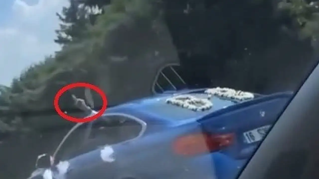 Bursa'da düğün konvoyunda gelin arabasının camından tabanca çıkaran bir kişi, yaklaşık 15 el ateş etti. O anlar cep telefon kamerasına yansıdı.