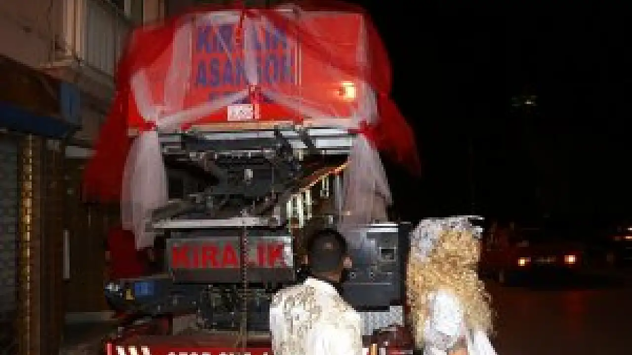 Bursa'da iki gece süren Roman düğünü, ilginç görüntülere sahne oldu. Düğünün yapıldığı alana ilk gece tekerlek takılmış deniz yelkeniyle gelip davetlileri selamlayan gelin, ertesi gece ise damatla yük asansörünün sepetine binip kalabalığın arasına bu vinçle indi.