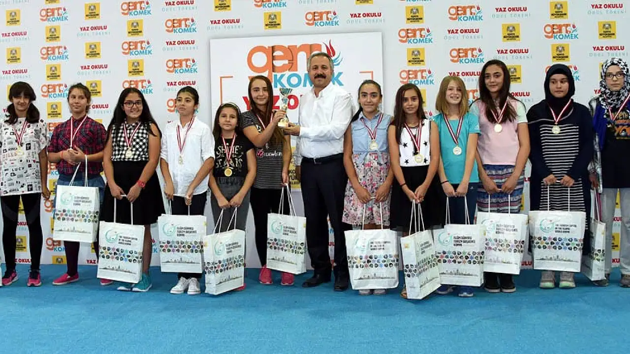 Büyükşehir Belediyesinin Genç KOMEK Yaz Okulu eğitimleri kapsamında düzenlenen turnuvalarda dereceye giren öğrencilere ödülleri verildi. Genç KOMEK Yaz Okulu eğitimleri bu hafta sona ererken, ağırlıklı olarak Temel Dini Bilgiler, Kur’an-ı Kerim ve Siyer derslerinin yanı sıra öğrenciyi motive edici ve yeteneklerini keşfetmesi açısından birçok spor ve sanat etkinlikleri düzenlendi. Aliye Hüseyin Tekbaş Spor Salonunda düzenlenen törenle dereceye giren öğrenciler ödüllendirildi.