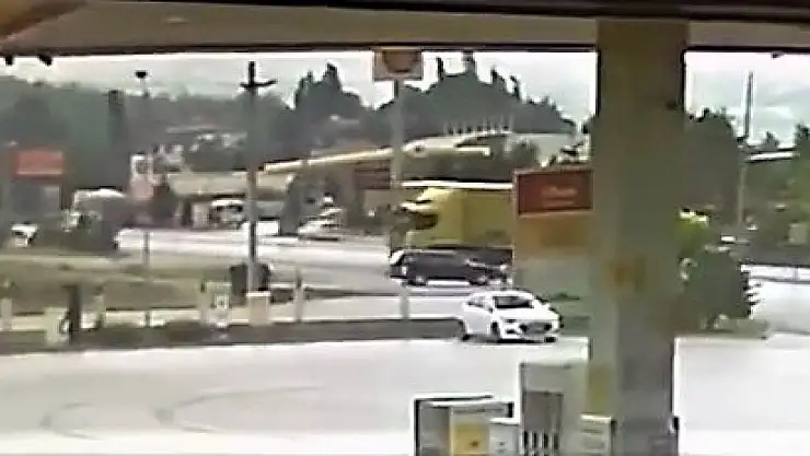 Sürünün ölümden saniyelerle kurtulduğu kazada, otomobile çarpmadan sürüklenemeye devam eden tır, yolun kenarındaki bankete hızla çarptıktan sonra istasyona metreler kala durabildi. Yaşanan korku dolu anlar, istasyonun güvenlik kameralarına saniye saniye yansıdı. Görüntülerde kontrolden çıkan tırın sürüklendiği, otomobilin geri vites yaparak ezilmekten son anda kurtulduğu ve istasyonunda kazaya şahit olanların panik dolu anları yer aldı.