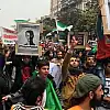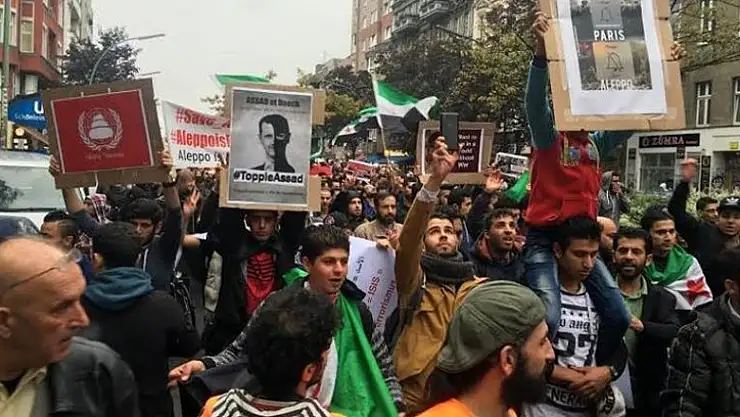 Demonstrators marched in Berlin’s Kreuzberg district, raising flags of the Syrian revolution and carrying placards that read “Save Aleppo”, “Aleppo is Burning”, “Stop Assad and Putin” and “Russia Stop Bombing Civilians!”