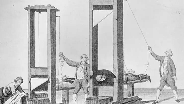 1789 Fransız İhtilali'nden sonra bir insan mezbahasına döndürülen Fransa'da, her gün yüzlerce adam, balta veya kılıçla başı kesilerek, çekiç darbeleriyle kemikleri kırılarak, ayrı yönlere çekilen atlarla kolları, bacakları koparılarak, diri diri yakılarak ve hâlâ can çekişiyorsa asılarak öbür idam ediliyordu.