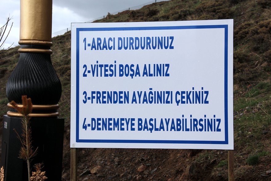 Belediye tarafından konulan iki tabelanın ilkinde 'Gizemli yol başlangıcı' yazarken ikincisinde nasıl hareket edilmesi gerektiği anlatılıyor. Tabelada aracın durdurulması, vitesin boşa alınması ve ayağın frenden çekildikten sonra denemeye başlanması tavsiye ediliyor.