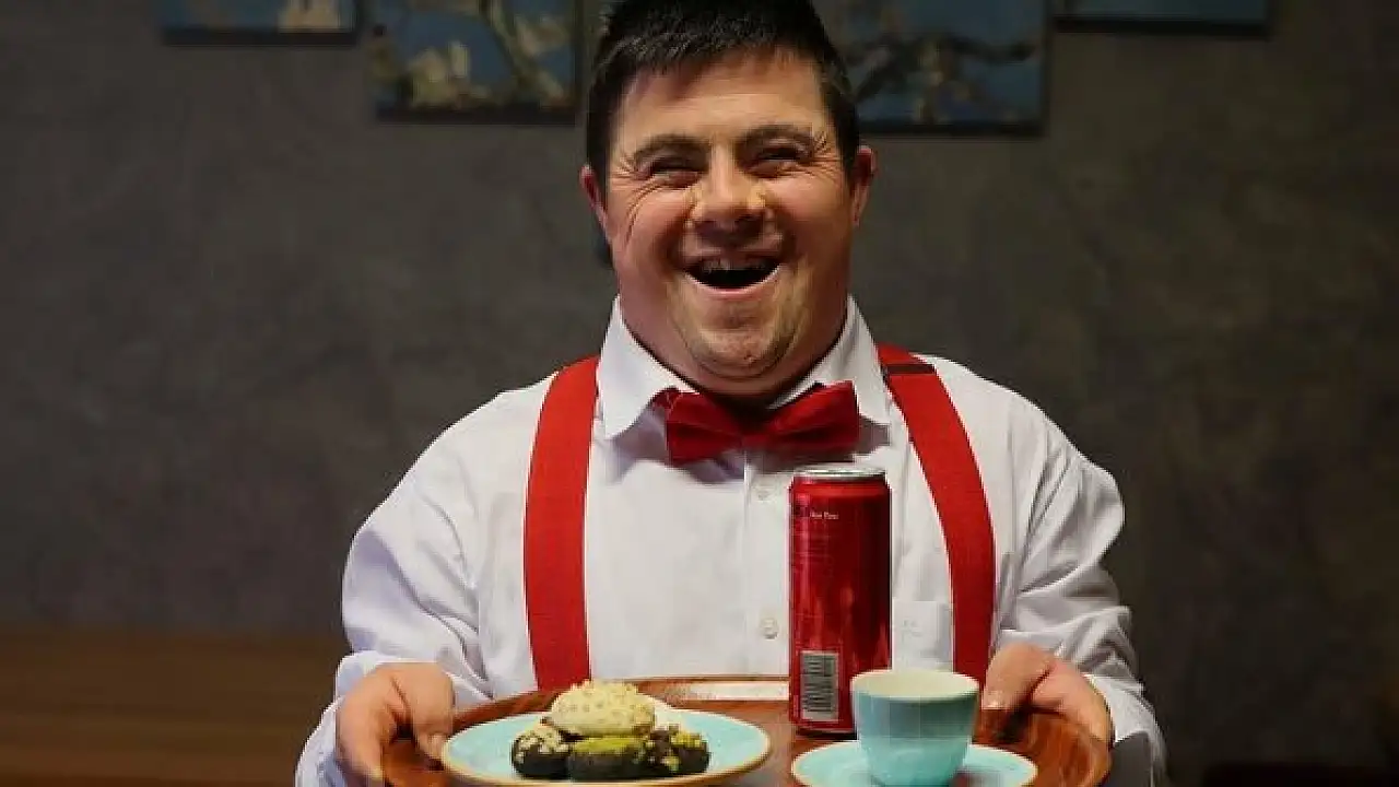 Gaziantep'te glütensiz ürünlerin bulunduğu kafede garsonluk yapan, samimi tavırları ve neşeli halleriyle hem müşterilerin hem de çalışma arkadaşlarının sevgisini kazanan 30 yaşındaki down sendromlu Ahmet Görmez'in yüzünden tebessüm eksik olmuyor