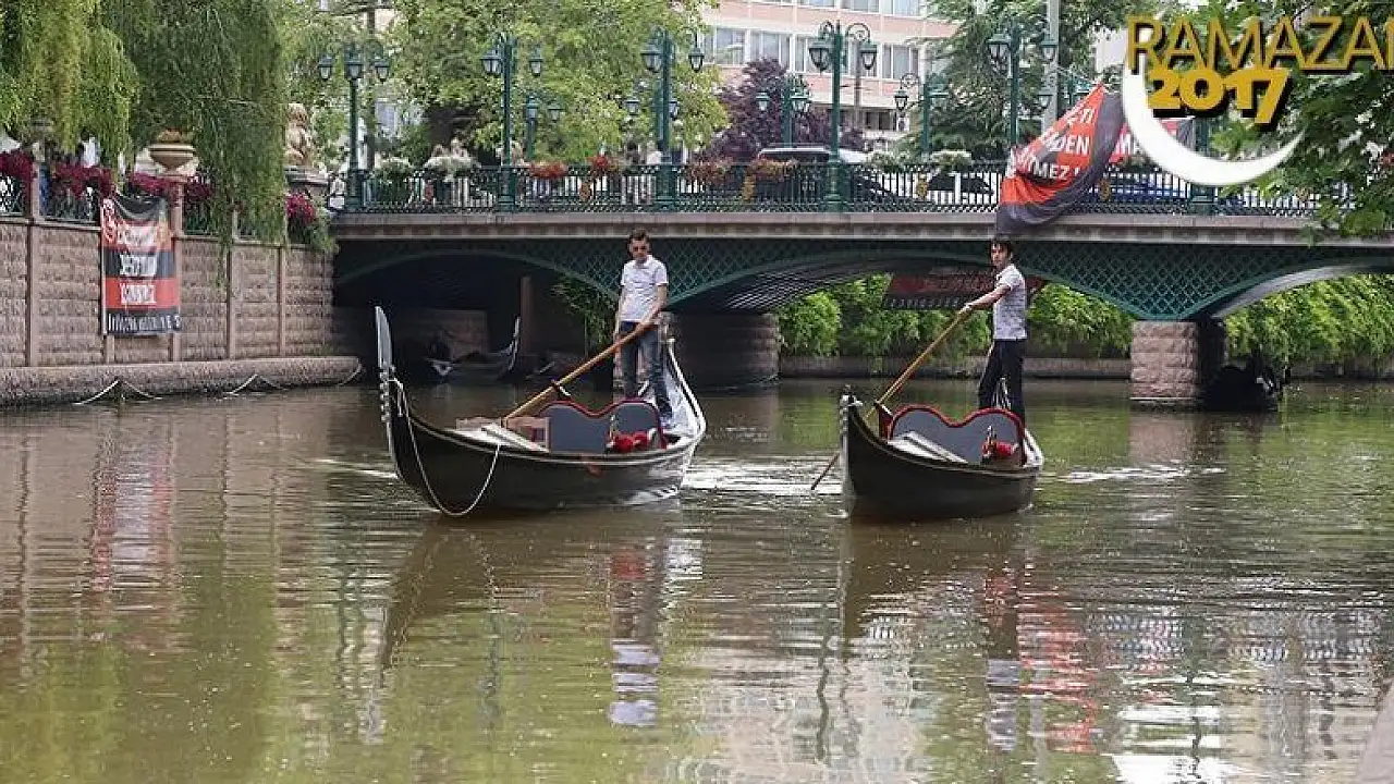 Eskişehir'de ziyaretçilerin Porsuk Çayı'nda bindiği gondolların kürek çeken kaptanlarının zorlu mesaisi ramazanda da sürüyor.